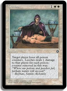 Target player loses all poison counters. Leeches deals 1 damage to that player for each poison counter removed in this way.