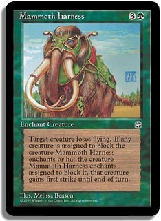 Target creature loses flying. If any creature is assigned to block the creature Mammoth Harness enchants or has the creature Mammoth Harness enchants assigned to block it, that creature gains first strike until end of turn.
