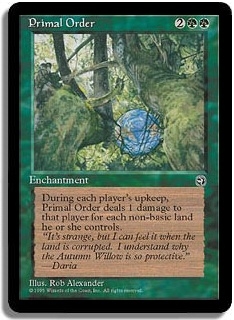 During each player's upkeep, Primal Order deals 1 damage to that player for each non-basic land he or she controls.