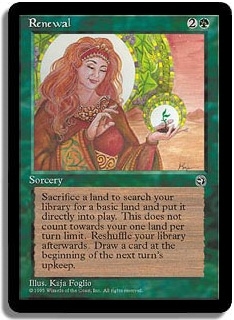 Sacrifice a land to search your library for a basic land and put it directly into play. This does not count towards your one land per turn limit. Reshuffle your library afterwards. Draw a card at the beginning of the next turn's upkeep.