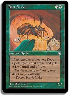 If assigned as a blocker, Root Spider gains first strike and +1/+0 until end of turn.