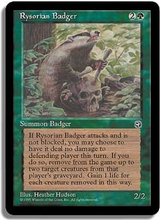 If Rysorian Badger attacks and is not blocked, you may choose to have it deal no damage to defending player this turn. If you do so, remove from the game up to two target creatures from that players graveyard. Gain 1 life for each creature removed in this way.