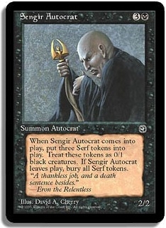 When Sengir Autocrat comes into play, put three Serf tokens into play. Treat these tokens as 0/1 black creatures. If Sengir Autocrat leaves play, bury all Serf tokens.