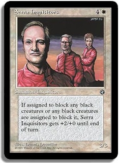 If assigned to block any black creatures or any black creatures are assigned to block it, Serra Inquisitors gets +2/+0 until end of turn.