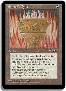 <3,T>: Target player looks at the top three cards of his or her library and puts one of them on top of that library. Remove the remaining two from the game.