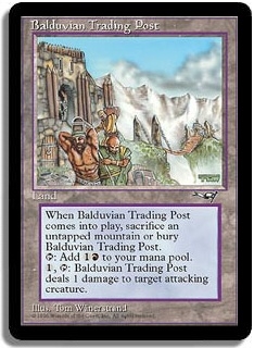 When Balduvian Trading Post comes into play, sacrifice an untapped mountain or bury Balduvian Trading Post. <T>: Add <1R> to your mana pool. <1,T>: Balduvian Trading Post deals 1 damage to target attacking creature.