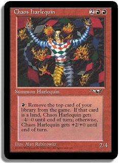<R>: Remove the top card of your library from the game. If that card is a land, Chaos Harlequin gets -4/-0 until end of turn; otherwise, Chaos Harlequin gets +2/+0 until end of turn.