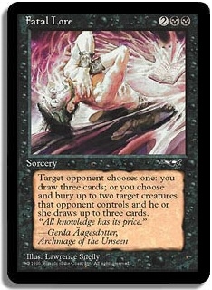 Target opponent chooses one: you draw three cards; or you choose and bury up to two target creatures that opponent controls and he or she draws up to three cards.