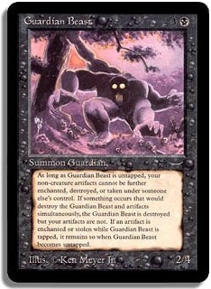 As long as guardian Beast is untapped, your non-creature artifacts cannot be further enchanted, destroyed, or taken under someone else's control. If something occurs that would destroy the Guardian Beast and artifacts simultaneously, the Guardian Beast is destroyed but your artifacts are not. If an artifact is enchanted or stolen while Guardian Beast is tapped, it remains so when Guardian Beast becomes untapped.