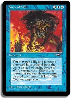 You may pay 1 life and remove a blue card in your hand from the game instead of paying Force of Will's casting cost. Effects that prevent or redirect damage cannot be used to counter this loss of life. Counter target spell.
