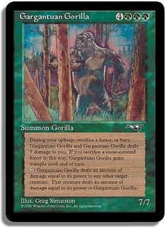 During your upkeep, sacrifice a forest, or bury Gargantuan Gorilla and Gargantuan Gorilla deals 7 damage to you. If you sacrifice a snow-covered forest in this way, Gargantuan Gorilla gains trample until end of turn. <T>: Gargantuan Gorilla deals an amount of damage equal to its power to any other target creature. That creature deals an amount of damage equal to its power to Gargantuan Gorilla.