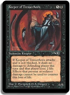 If Keeper of Tresserhorn attacks and is not blocked, it deals no damage to defending player this turn and that player loses 2 life. Effects that prevent or redirect damage cannot be used to counter this loss of life.