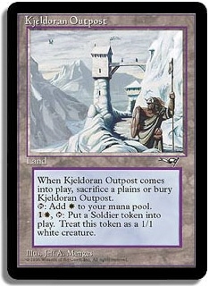 When Kjeldoran Outpost comes into play, sacrifice a plains or bury Kjeldoran Outpost. <T>: Add <W> to your mana pool. <1W,T>: Put a soldier token into play. Treat this token as a 1/1 white creature.