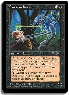 At the end of any turn, if Krovikan Horror is in your graveyard with a summon card directly above it, you may put Krovikan Horror into your hand. <1>: Sacrifice a creature to have Krovikan Horror dead 1 damage to target creature or player.