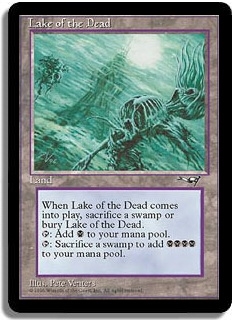 When Lake of the Dead comes into play, sacrifice a swamp or bury Lake of the dead. <T>: Add <B> to your mana pool. <T>: Sacrifice a swamp to add <BBBB> to your mana pool.
