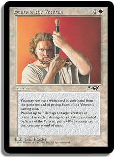 You may remove a white card in your hand from the game instead of paying Scars of the Veteran's casting cost. Prevent up to 7 damage to target creature or player. For each 1 damage to a creature prevented by Scars of the Veteran put a +0/+1 counter on that creature at end of turn.