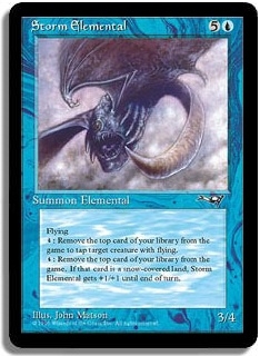 Flying. <U>: Remove the top card of your library from the game to tap target creature with flying. <U>: Remove the top card of your library from the game. If that card is a snow-covered land, Storm Elemental gets +1/+1 until end of turn.