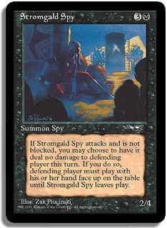 If Stromgald Spy attack and is not blocked, you may choose to have it deal no damage to defending player this turn. If you do so, defending player must play with his or her hand face up on the table until Stromgald Spy leaves play.