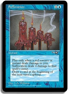 Play only when a red sorcery or instant deals damage to you. Suffocation deals 4 damage to that spell's caster. Draw a card at the beginning of the next turn's upkeep.