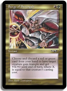Choose and discard a red or green card from your hand to have target creature gain trample and get +X/+0 until end of turn, where X is equal to that creature's casting cost.
