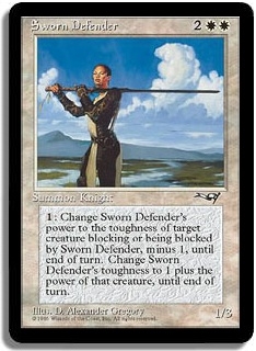 <1>: Change Sworn Defender's power to the toughness of target creature blocking or being blocked by Sworn Defender, minus 1, until end of turn. Change Sworn Defender's toughness to 1 plus the power of that creature, until end of turn.