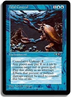 Cumulative Upkeep: <2>. Any player may pay <2> or 2 life to counter target red or green spell. Play this ability as an interrupt. Effects that prevent or redirect damage cannot be used to counter this loss of life.