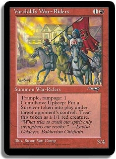 Trample, Rampage: 1, Cumulative Upkeep: Put a survivor token into play under target opponent's control. Treat this token as a 1/1 red creature.