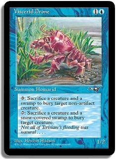 <T>: Sacrifice a creature and a swamp to bury target non-artifact creature. <T>: Sacrifice a creature and a snow-covered swamp to bury target creature.