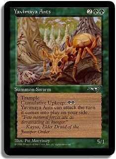 Trample, Cumulative Upkeep: <GG>. Yavimaya Ants can attack the turn it comes into play on your side.