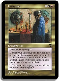 Cumulative upkeep: <1>. During your upkeep, put a rust counter on each artifact target opponent controls. If the number of rust counters on an artifact equals or exceeds that artifact's casting cost, bury the artifact. If Corrosion leaves play, remove all rust counters from the game.