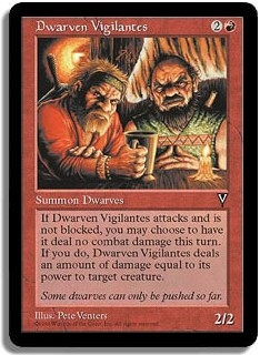 If Dwarven Vigilantes attacks and is not blocked, you may choose to have it deal no combat damage this turn. If you do, Dwarven Vigilantes deals an amount of damage equal to its power to target creature.