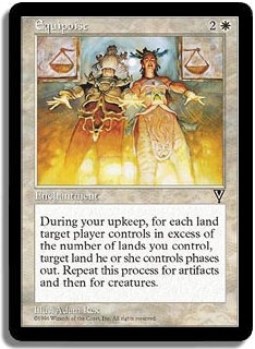 During your upkeep, for each land target player controls in excess of the number of lands you control, target land he or she controls phases out. Repeat this process for artifacts and then for creatures.