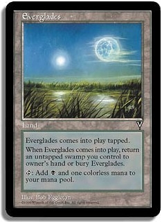 Everglades comes into play tapped. When Everglades comes into play, return an untapped swamp you control to owner's hand or bury Everglades. <T>: Add <B> and one colorless mana to your mana pool.