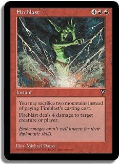 You may sacrifice two mountains instead of paying Fireblast's casting cost. Deal 4 damage to any one target.