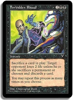 <Sacrifice a card in play>: Target opponent loses 2 life unless he or she sacrifices a permanent or chooses and discards a card. You may repeat this process as many times as you choose.
