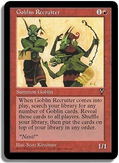 When Goblin Recruiter comes into play, search your library for any number of Goblin cards. Reveal those cards to all players. Shuffle your library, then put the cards on top of your library in any order.