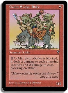 If Goblin Swine-Rider is blocked, it deals 2 damage to each attacking creature and 2 damage to each blocking creature.