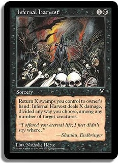 <Return X swamps you control to owner's hand>: Infernal Harvest deals X damage, divided in any way you choose, among any number of target creatures.
