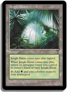 Jungle Basin comes into play tapped. When Jungle Basin comes into play, return an untapped forest you control to owner's hand or bury Jungle Basin. <T>: Add <G> and one colorless mana to your mana pool.