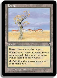 Karoo comes into play tapped. When Karoo comes into play, return an untapped plains you control to owner's hand or bury Karoo. <T>: Add <W> and one colorless mana to your mana pool.