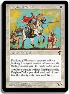 Flanking. <1W>: Each creature without flanking blocking Knight of Valor gets -1/-1 until end of turn. Use this ability only once each turn.