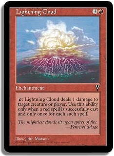 <R>: Lightning Cloud deals 1 damage to target creature or player. Use this ability only when a red spell is succesfully cast and only once for each such spell.