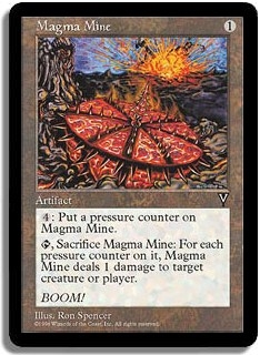 <4>: Put a pressure counter on Magma Mine. <T,Sacrifice Magma Mine>: For each pressure counter on it, Magma Mine deals 1 damage to target creature or player.