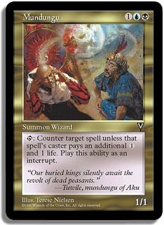 <T>: Counter target spell unless that spell's caster pays an additional <1> and 1 life. Play this ability as an interrupt.