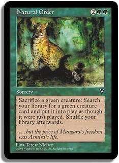 <Sacrifice a green creature>: Search your library for a green creature card and put it into play as though it were just played. Suffle your library afterwards.