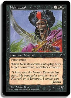First Strike. When Nekrataal comes into play, bury target nonartifact, nonblack creature.