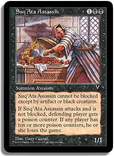 Suq'Ata Assassin cannot be blocked except by artifact or black creatures. If Suq'Ata Assassin attacks and is not blocked, defending player gets a poison counter. If any player has ten or more poison counters, he or she loses the game.