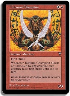 First Strike. Whenever Talruum Champion blocks or is blocked by any creature, that creature loses first strike until end of turn.
