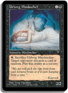 <B, Sacrifice Urborg Mindsucker>: Target player discards a card at random. Play this ability as a sorcery.