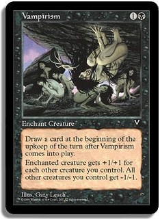 Draw a card at the beginning of the upkeep of the turn after Vampirism comes into play. Enchanted creature gets +1/+1 for each other creature you control. All other creatures you control get -1/-1.